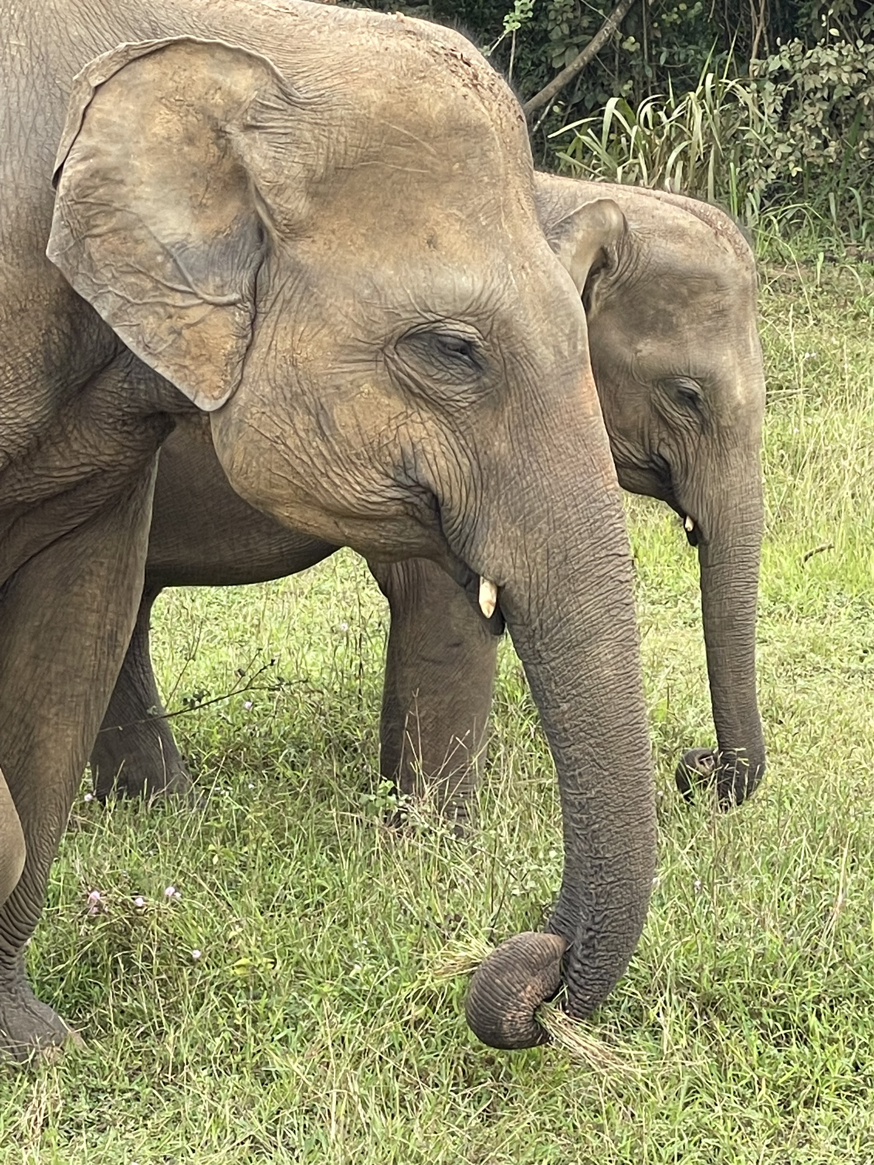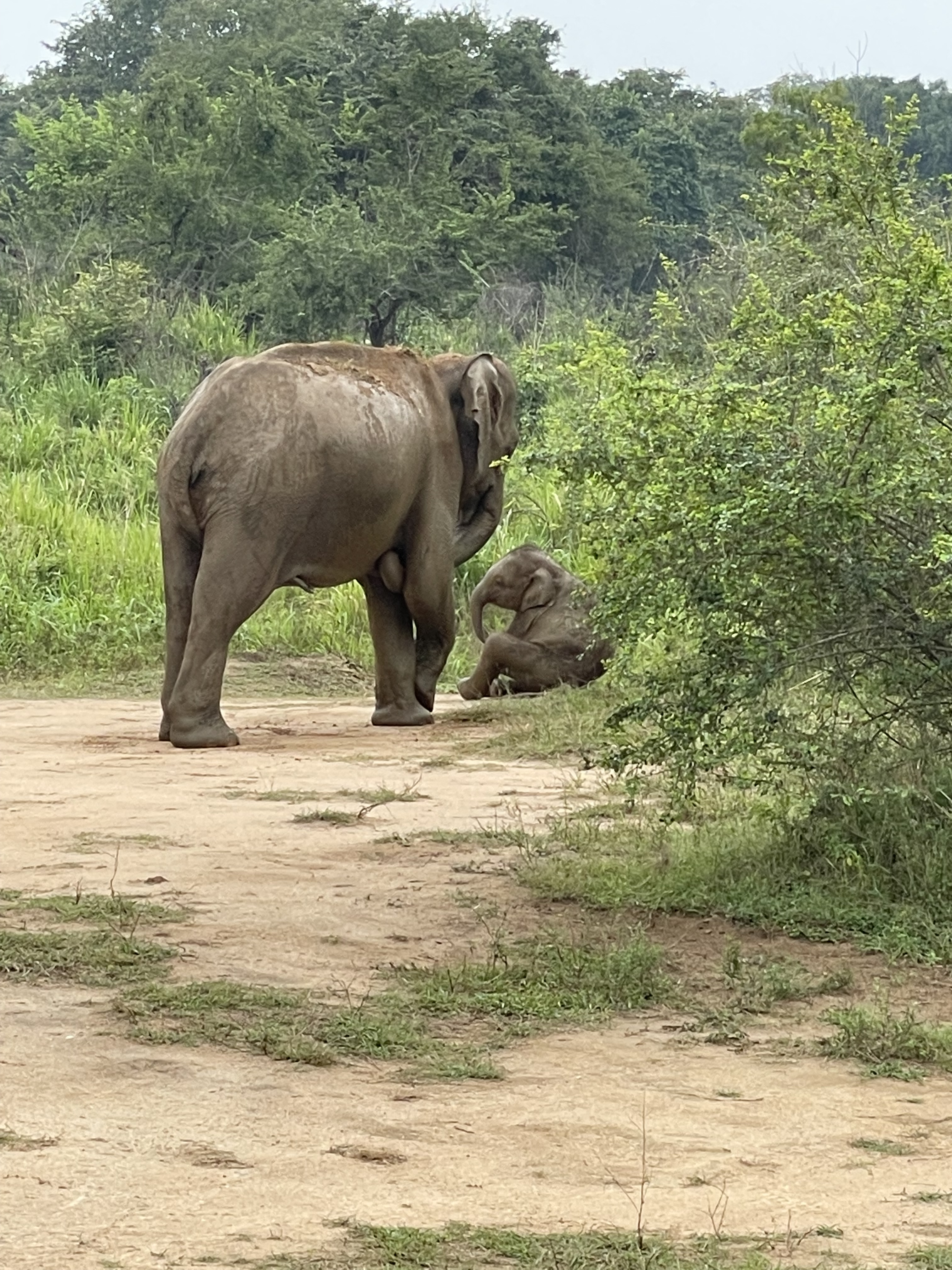 Bereits auf dem Weg zu Kavinda befuhren wir die Straße durch 2 Teile des Nationalparks und die Aufregung war groß als der erste Elefant direkt neben der Straße auf uns wartete…Um ehrlich zu sein hatte ich erst auf der bekannten B35 Richtung Yala Nationalpark damit gerechnet und nicht schon 10km von unserer Unterkunft entfernt…Bei aller Aufregung parkten wir in sicherem Abstand für ein erstes Foto. Denn obwohl die Dickhäuter sehr schwerfällig aussehen, können diese jedoch ganz schön schnell unterwegs sein, sollten sie sich bedroht fühlen…also ging es weiter zu Kavinda…