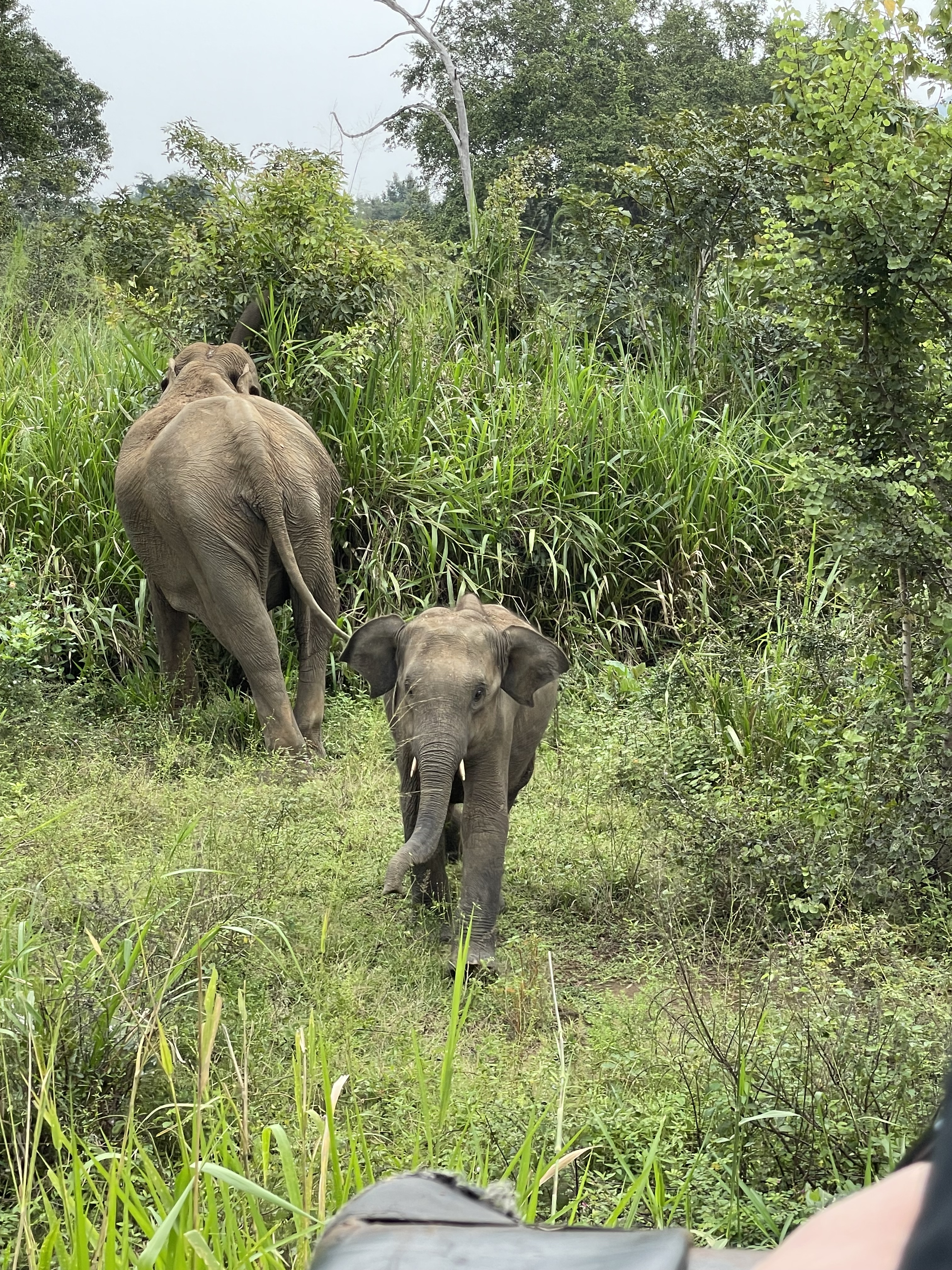 Nach kurzem Kennenlernen waren wir „Safari-bereit“ und los gings Richtung Nationalpark…kaum 5 Minuten und 3 Kurven später sahen wir die erste Elefantengruppe. Kavinda war hier sowie auf der gesamten Tour stets darauf bedacht die Tiere mit einem respektvollen Abstand zu beobachten und diese nicht zu stören. Also genau das was wir uns unter einer angemessenen Safari vorgestellt hatten.